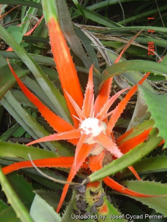 Description: Bromelia humilisSN|31870]]SN|31870]] is a terrestrial bromeliad that makes a neat plant with its great number of narrow, spiny-edged leaves forming a somewhat flattened rosette. When in bloom, the central leaves surrounding the inflorescence turn a deep cardinal red colour making it very showy. The actual flowers are somewhat hidden down in the very middle of the plant; however, the wooly white covering of the flower-head is conspicuous.