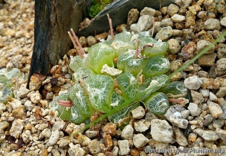 The leaves have translucent, glass-like tops with jelly-like contents, stored for the times of drought. Leaf translucence has earned this and several other succulents with similar appearance the local Afrikaans name of waterglasie (little water glass).