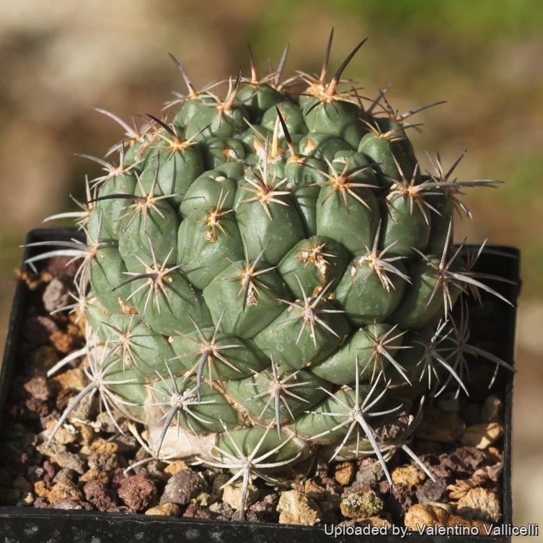 Central spines: 3, rigid, stiff, white to brown, often with black tips, about 1.2-2,5 cm long. The lower one is curved and descending, while the upper and lateral ones are shorter.