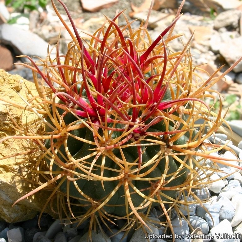 This is is a cultivated form with stunning red spines. It is one of the best and colourfull Ferocacti though quite slow growing. This plant is very densely spined and because of that, will tolerate full sun.