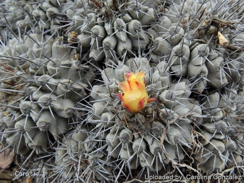 Blooming habit at Huasco in coastal Atacama desert of northern Chile. The distinguishing characteristic of this species is a prominent chin-like protuberance below the areole, more pronounced than in any other species of Copiapoa.