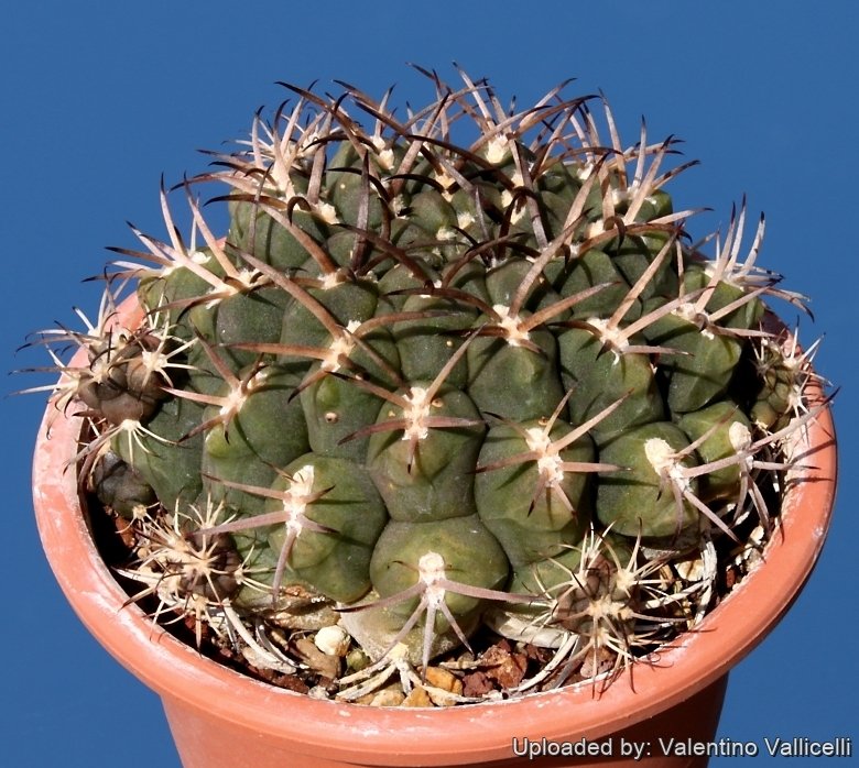 Description: Gymnocalycium marsoneriSN|13338]]SN|13338]] is a globular cactus, rather flattened, with spreading and sometimes recurved spines. They are a rich brown and form a pleasing contrast against the bronze-green body.
