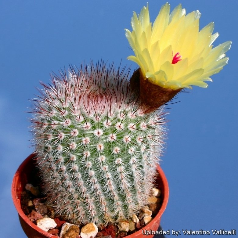 (Locality: Laguna Garzon) It has very pretty, soft, silvery-white, fir-like spines, often with red centrals. The exciting lemon-yellow flowers with pale anthers and scarlet stigma open during the day and close at night.