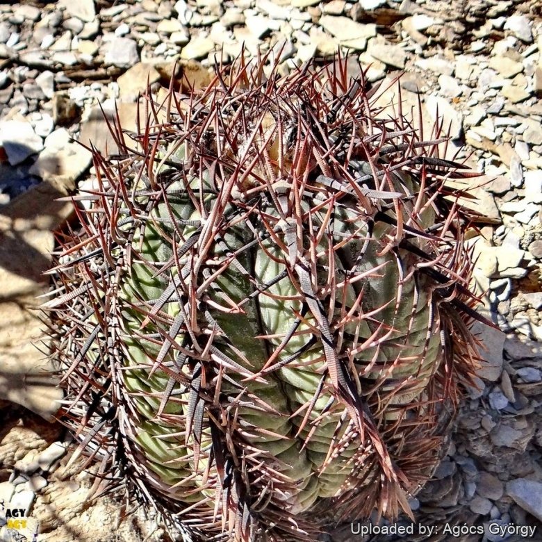 It makes a single globular though very flattened stem, greyish or bluish-green in colour with strong pink, grey, tan, or brown spines that generally not hide stem surface.