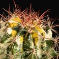 Description: Variegated ferocacti can be found (although not commonly) in cultivation and some of these variegated plants have a place in most collections. All variegates are mutants. Something has gone wrong with the cellular structure of the growth tip (apical meristem) of the plant. As a result of this mutation, chlorophyll is missing from some or all layers of the plant epidermis. The odd variegate appears in many seedling batches in a small percentage (especially among hybrid seeds) and are generally separated from normal plants. Variegated plants grow slower and are generally smaller than non-variegates of the same species. Coloured areas are also generally weaker, and more susceptible to fungus, sunburn and other defects. A large well grown variegate ferocactus is truly an achievement. These are harder to grow well than they appear.