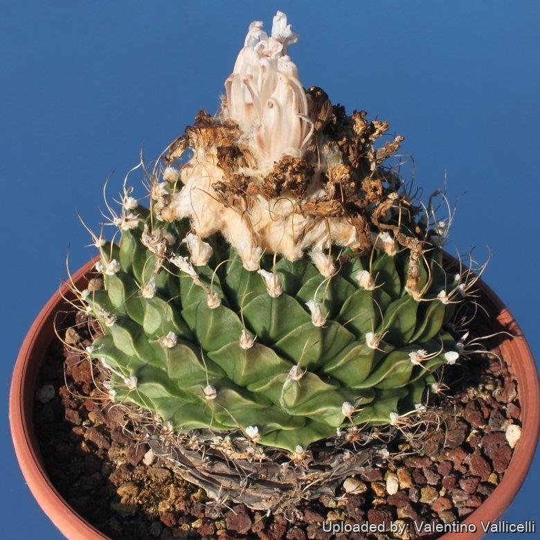 Stem: Solitary, globular-squashed resembling an inverted pine cone with a woolly centre, it grows up to 15 (or more) cm in diameter and is greyish green to dark green.