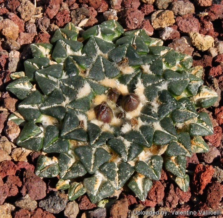 Tubercles: The tubercles are deltoid dark olive green with no spines and lie flat on the soil surface. They are more long than wide, closely packed and divergent, sharply angled apically.