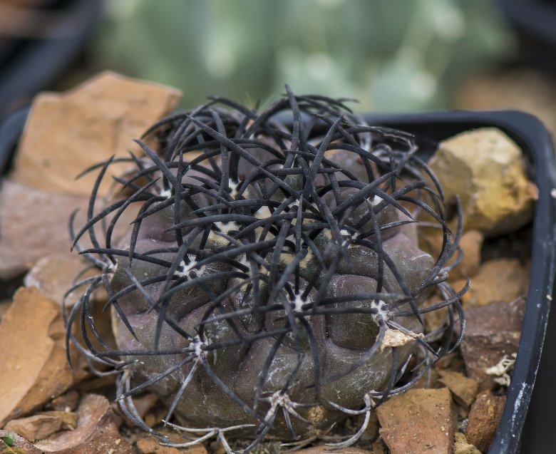 Copiapoa echinoides (Lem.) Britton ex Rose in Britton & Rose: small growing plant with dark purplish-brown stem and thick curved amber-maroon to black spines. This appears to be a very variable species.