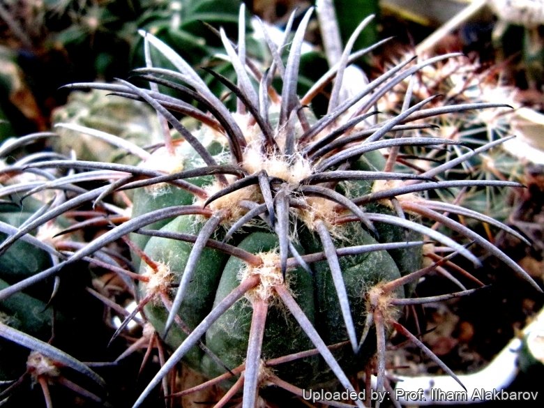 Gymnocalycium cardenasianum cv. Japanese Selection: has long, stout spines, eagle claw-shaped, typically-twisted, up to 4 cm long. Black turning dark grey as they ages. It has been selected in Japan.