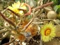 Flowers: Originates in the subterminal portion of the developing tubercles, not in the plant apex. The flowers are diurnal, yellow, with the base of the inner perianth segments orange coloured. Outer segments greenish yellow, The receptacular tube displays papyraceous, lanceolate scales, with terminal aristae and short white hairs in the axil; Lanceolate scales with white hairs in the axil are also presents in the pericarpel.