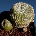 Stem: Single, more rarely with two or more heads, very small; (in habitat a specimen of 25 mm diameter is an extraordinarily fat and old plant). They have a flat top, with a woolly depression in the centre. This superior disk is the only visible part of the plant and the only part receiving the sun’s rays. The lateral part of the stem is almost cylindrical and is rugose. Cultivated plants change dramatically in their aspect and become soon elonged.