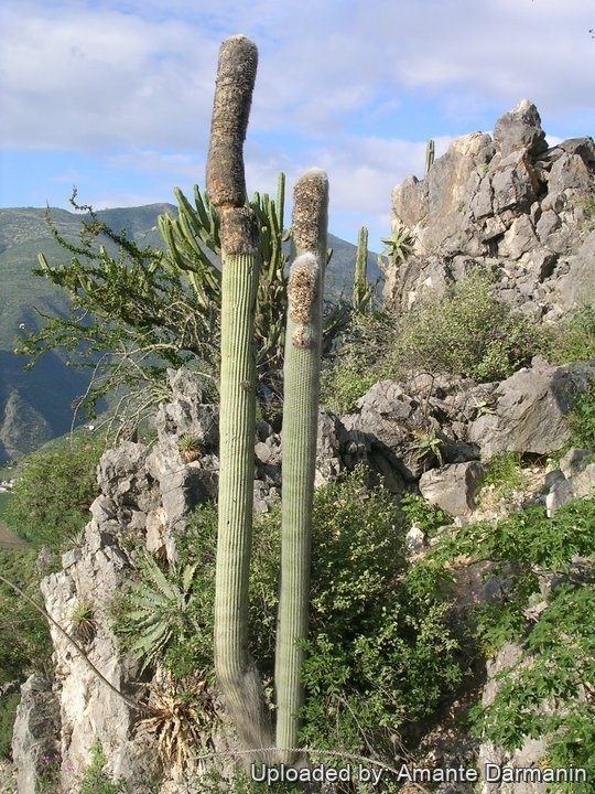 Habitat and Ecology: The species is restricted to calcareous canyons within xerophile vegetation, and is one of the dominant elements of the xerophile scrub where it grows. The house finch eats the fruits/seed in June, July and November. It.is very common on limestone hills of eastern Hidalgo, where it is often the most conspicuous plant in the landscape. Large individuals are common here and are often 15 meters high. This species is locally abundant, but there is a continuing decline in mature individuals. This is one of the most commonly used succulent species for ornamental purposes. It is removed from the wild and cultivated. Over-collection of juveniles is also an ongoing threat and likely causing an imbalance in age distributions of sub-populations. The cephalia of this species is cut to obtain fruits and seeds. The species may be at risk from pastoral agriculture.