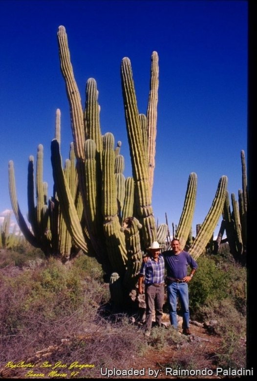Description: The Cardón Gigante, Pachyrereus pringlei, is one of a well-known group of spectacular columnar cacti from the Sonoran Desert that includes the saguaro (Carnegiea giganteaSN|6374]]SN|6374]]), the organ-pipe cactus (Stenocereus thurberiSN|8265]]SN|8265]]) and senita (Lophocereus schottiiSN|8344]]SN|8344]]) which are famous because of their immense size and unique architecture. The Cardón Gigante occasionally reaching almost 20 m in height and 5 m spread, with a trunk diameter of 2 metres and a weigh of several tons. It may lives to more than 200 years and may be the largest cactus in the world.