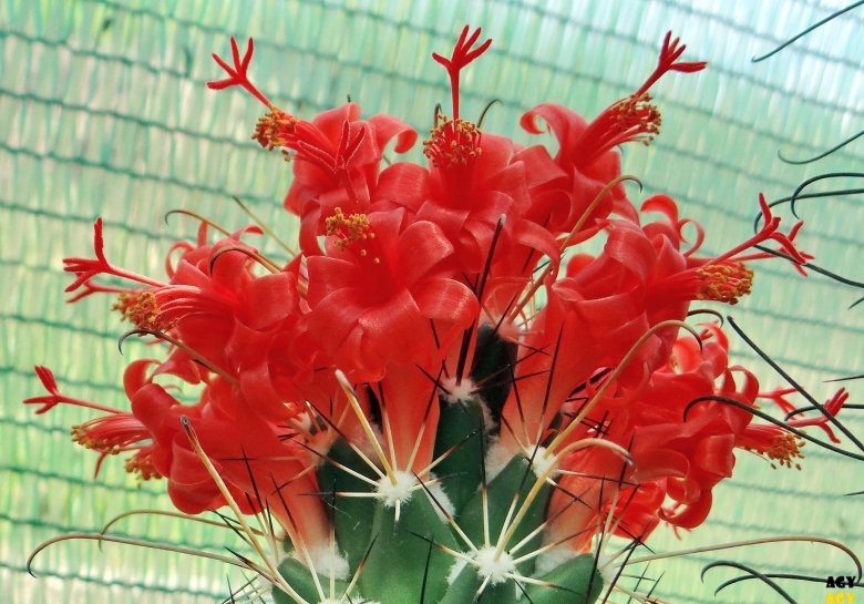 Flowers: Bright scarlet or red-orange rather unique in shape and appearance, appearing in the upper axils (like in Mammillaria), but near the stems apex, 3 cm or more long, zygomorphic, with a long curved tube and oblique limb with double ring of recurring segments reminiscent of Epiphyllum, but don’t open very wide; stamens and style are red and exserted, but with yellow pollen adding a colour contrast.