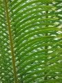Leaves: Bright green, semiglossy, arranged in a rosette pattern 150-270 cm long flat (not keeled) in section . Petiole 34-70 cm long, partly or entirely spinescent. Petiole and pinnae pubescent. Pinnae (leaflets) 54 to 110 more or less opposed each other along the central stem(opposing leaflets inserted at 180° on rachis), median pinnae 23-36 cm long, 9-13 mm wide with 9-14 mm spacing between pinnae, margins flat, midrib raised above and distinct below. New emerging leaves have a glaucous sheen. Young leaves are densely pubescent but as they grow older they become glabrous.