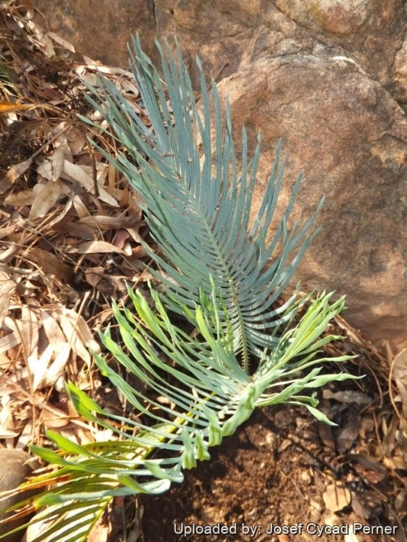 Description: Cycas desolata is a medium to large species of cycad, a palm-like plant usually less than 4 metres tall, but individual plants may occasionally exceed 7 m in height. This species is distinguished from other Australian species by the strongly glaucous, light blue foliage with relatively few leaflets, and the spine-free petioles. The leaflets (pinnae) are narrow (mostly less than 4 mm wide) and the Cataphylls (Modified leaf, much reduced and thickened, serving to protect the apical meristem in cycads produced in flushes preceding the emergence of cones or leaves) are long and pungent.