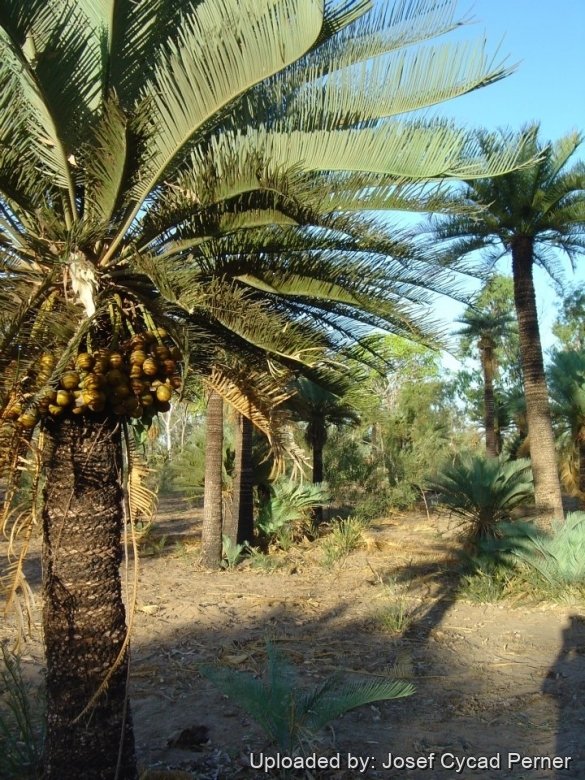 Description: Cycas angulataSN|31951]]SN|31951]] is a robust palm-like cycad with blue-grey-green, strongly keeled (V-shaped) fronds, and long, narrow, leaflets. It has a distinct trunk and frequently branched stems growing to 5 m (rarely 12 m) tall. Older specimens lose the leaf base scars and gain a more checkerboard appearance. The stout trunks, topped with thick arching fronds make them a very attractive species, and probably this is the cycad most mentioned as a food source by Northern Territory aborigines. Cycads are dioecious (have distinct male or female cone-bearing plants) and pollen needs to be transported from male to female cones on separate plants for pollination, and subsequent fertilisation and seed production, to occur.