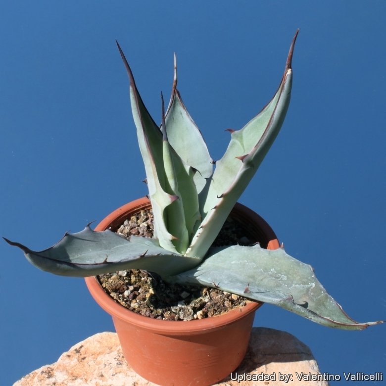 Leaves: This species has fewer leaves compared with other agaves, but they are strong, broad, rigid, plane to cup-shaped on cross section, smooth, thick, broadly lanceolate, acuminate, widest in the middle, markedly narrowed at base, 40-75 cm long, 11-16 cm wide. The basal half of the margin is well armed with widely spaced prominent teeth on wavy mammilate projections. Teeth mostly 10-20 mm and even longer, the bases thick, frequently 2-3 cuspidate dark-brown to grey, oddly flexed and curved, generally remote, up to 6-8 cm apart. The terminal part of the leaf-margin toward the long tapering tip is horny and toothless. The leaves colour varies from dusky green, to green or grey, turning red to purplish with flowering, and sometimes these leaves are distinctly striped with pale blue bud imprints. The terminal spine is large and sharp, 3-6 cm long deeply sulcate above, straight or sinuous long decurrent and to form the corneous margin, sometimes to mid-leaf.