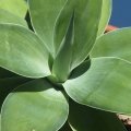 Leaves: Wide, soft, pliable, somewhat translucent ovate-accuminate, 50-70 cm long and 12-16 cm large. The leaves are powdery green, light yellowish green or grey/blue green.There are no teeth, nor terminal spines, although the leaves taper to points that fray with age. They emerge from a tight central spear to arch gracefully back, looking a bit like a large open green flower.