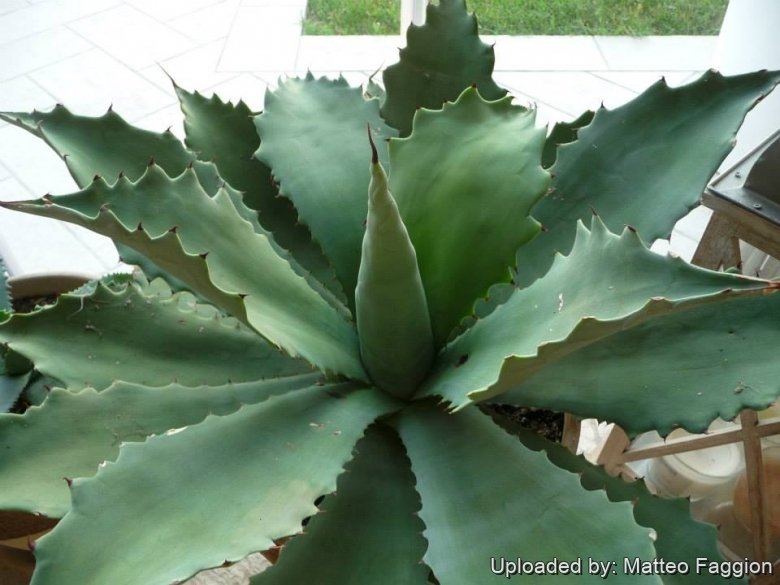 Leaves: Broadly lanceolate 15 to 20 cm. wide, 35 to 60 cm long, very light green, pale blue or nearly white, with heavy recurved blackish thorns along their margins. However the leaves are quite variable on different variants of the species and can bear different coloured teeth and spines; the red brown ones look particularly attractive on the fresh green of the leaf-lamina. The apical spine is large dark reddish-brown to grey 8 mm wide and 50 to 60 mm long.