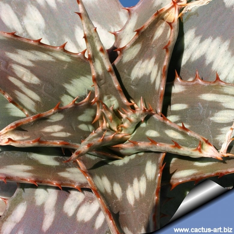 It is a small maculated aloe. Both surfaces of the leaves has irregular white spots in rows. A peculiar characteristic (not a defect!) of this plant is that the the tips of the leaves dry out naturally in summer and during time of drought forming an attractive curl, so this should not be a cause for concern in cultivation.