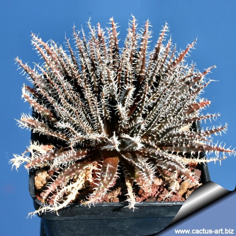 Leaves: Up to 4 cm long, thin, lanceolate, not rigid, dark green with terminal spine and white small pustules and soft feathery bright white marginal hairy spines.