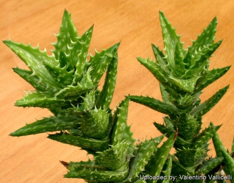 It is very attractive and forms smallish spikey rosettes from the base. Leaves are bright green with lighter green spots on inner and outer surfaces.