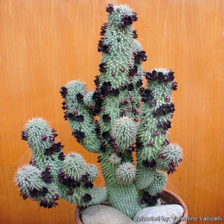 Stem: Stricltly cylindrical up to 80 cm tall, 3-6 cm in diameter, dark green to pale grey green (sometime with a purple hue). The knobbly surface helps to scatter the sun's radiation, minimising the amount of heat they absorb.