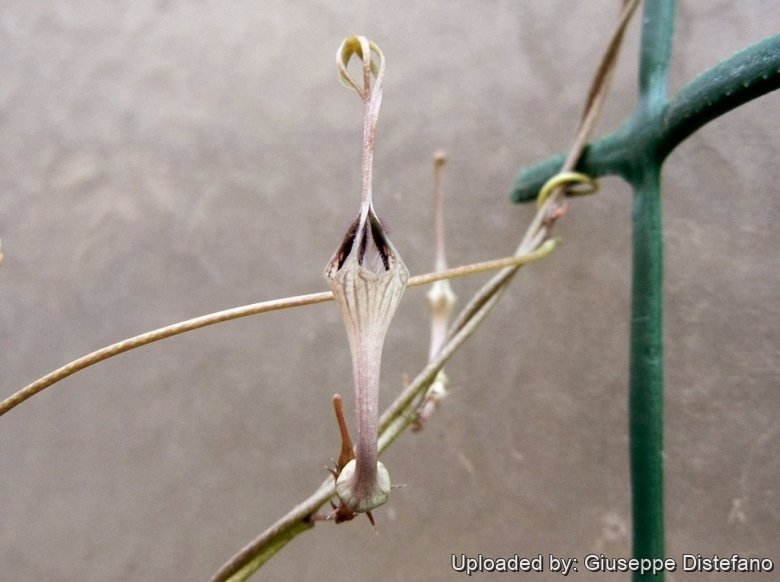 Flowers: Pedicels 2-4(-10) mm long, glabrous. Sepals subulate about 2.5 mm long. Calix base swollen, calyx 2.5-5 cm long with a basal globose inflation, sligtly 5-angled and costricted in the lower half, about 3.5 mm in diameter, inside purple hairless. Corolla-lobes, basally purple, thin, liner somewhat twisted together, usually joined above the middle, with hairs on the base and often along the margins too. Corona almost sessile. Outer corona-lobes 1-1.5 mm long broader than the inner corona.