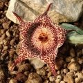 Flowers: Flower buds apically acute, abruptly broadening above the middle Sepals 1.5 - 3 mm long. Corolla star shaped, very shallowly campanulate, about 7 cm across, with a wide bowl-shaped centre, creamy white, darker inside and irregularly mottled with maroon. Annulus 1.8-2 cm across, paler, tube margin and annulus outside, maroon, tube 5-6 mm, bowl-shaped, cushion-shaped, interstaminal corona bowl shaped, at the base cream-coloured, blotched with brown-carmine. Anthers yellowish. Pollinia about 0.5 mm. Flowers smell like a dead rotting animal which baked in the sun and are very attractive to the flies that pollinate them. Sometimes flies lay eggs on the flower.