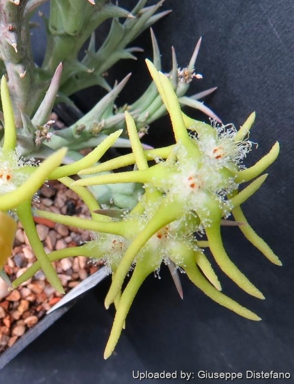 Stems: Erect or ascending, and branching from the base to 10 cm long and 8 mm wide, sides grooved; Tubercles subulate, very acute, ascending or horizontally spreading.