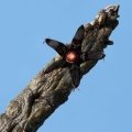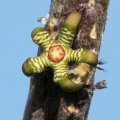 Flowers: Numerous, star-shaped, corolla about 1,5 cm wide, velvety, variable in colour and banding usually black or dark-maroon, but also dark-purple, dark green-brown or green, inside basally cream-coloured cross-banded with red-brown and the centre has often red tones to it with purple frilly vibratile hairs on the margins that blow in the breeze to attract its pollinators (flys). Flowers have a particular scent vaguely remembering of citrus.