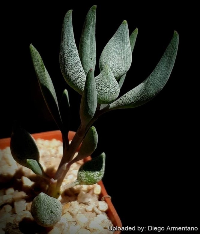 Habit: It is a dwarf, tufted, evergreen, perennial leaf-succulent that grows low- lying or creeping with partially upright shoots branching mainly below soil-level from a fleshy rootstock that may protrude from the soil. Form large clusters over time.