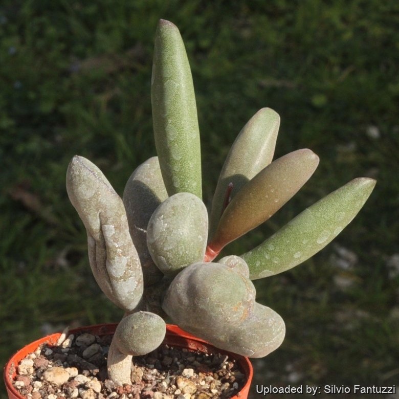 Adromischus marianae var. kubusensis (Uitewaal) Toelken: Very variable in leaf shape: the plain, grey-green leaves vary from long-cylindrical to short-fat. Distribution: Richtersveld mountains.