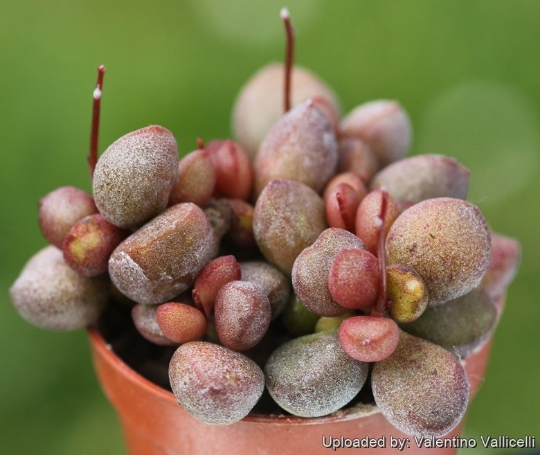 Leaves: 2-3 cm long, arranged in a spiral on the main stem, sub-spherical to elliptic, slightly concave above, faintly verrucose or almost smooth, grey-green to greyish brown with a thick bloom. Tip truncate. Base wedge-shaped. Margin at least in places horny.