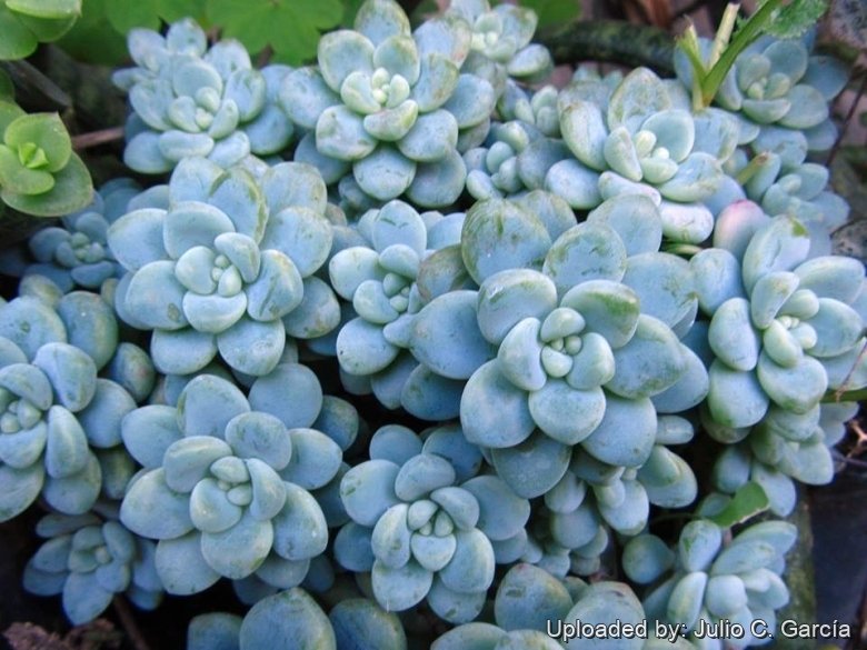 Description: Sedum clavatum Clausen (1975) has been only recently named, although it was earlier described in detail as the "Sedum of the Tiscalatengo Gorge" (Clausen, 1959) is a particularly attractive small succulent groundcover in the Pachysedum group with glaucous, thick, clavate forming clumps or mats to 10 cm tall but spreads outward over time. The specific epithet comes from the Latin word 'clava' meaning "club" for the baseball shape of the sepals. Several varieties available (blue forms etc.)