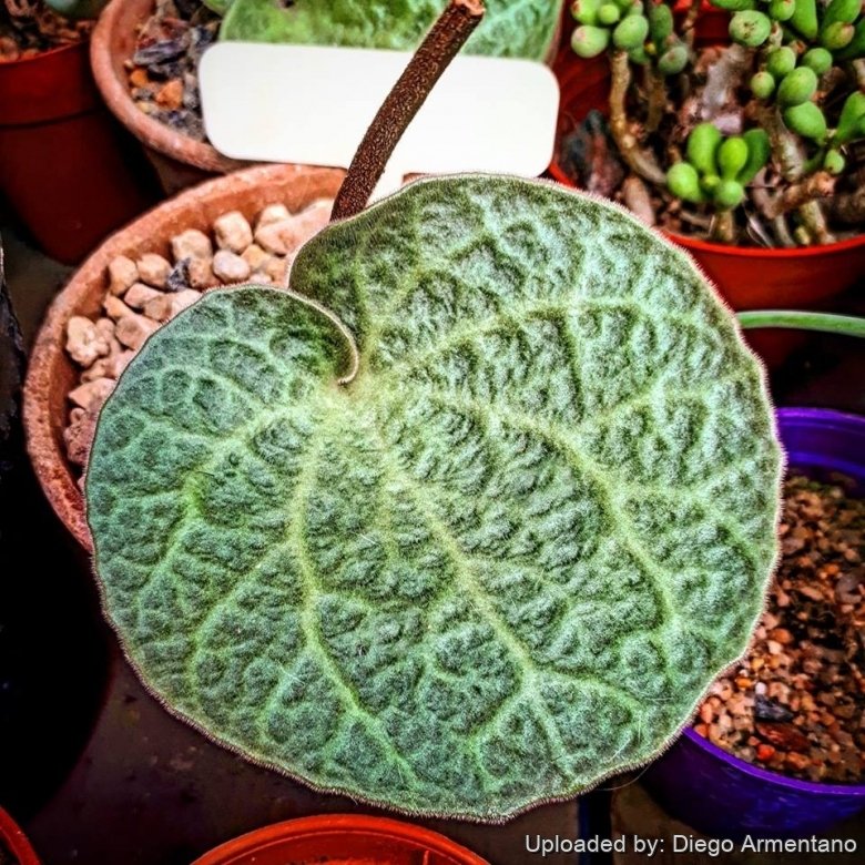 Leaves: Single, rarely two, shortly petiolate, spreading, covered with simple and glandular hairs. Blade orbicular, 50-80 mm in diameter, almost circular and deeply heart-shaped at the base, rounded at apex, vaguely crenate, concave-shaped, green with paler veins above, pale purple below with glandular hairs. Petiole 0-20 mm long. The leaves dries up as summer approaches. If you give too much water, however, more leaves can be produced as the plant gets all out of whack with the seasons.
