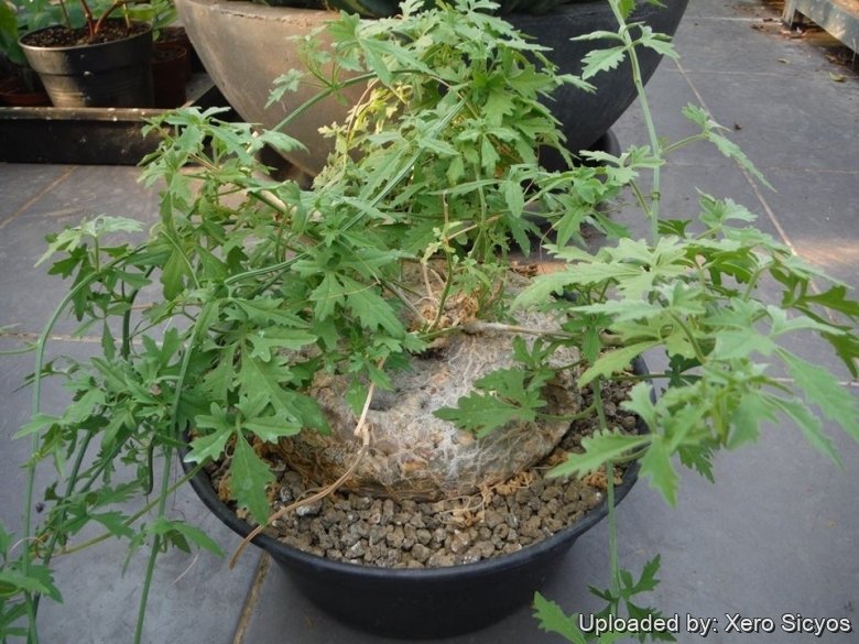 Description: Zygosicyos tripartitusSN|18079]]SN|18079]] (Xerosicyos tripartitusSN|18080]]SN|18080]]) is an edangered Madagascan perennial, caudiciform plant, with creeper vines characterized by tendrils. It produces a bun-shaped caudex covered in a much fissured corky rind. This species produces stems bearing 3-lobed leaves with distinctive wavy margins but variable in shape, as is typical for the Cucurbitaceae (cucurbit family). The plants are dioecious (Male/Female) and the flowers generally are small and greenish-yellow. This is perhaps the best of the geophytic cucurbits. This member of the Cucurbitaceae was described by Jean-Henri Humbert in 1945.