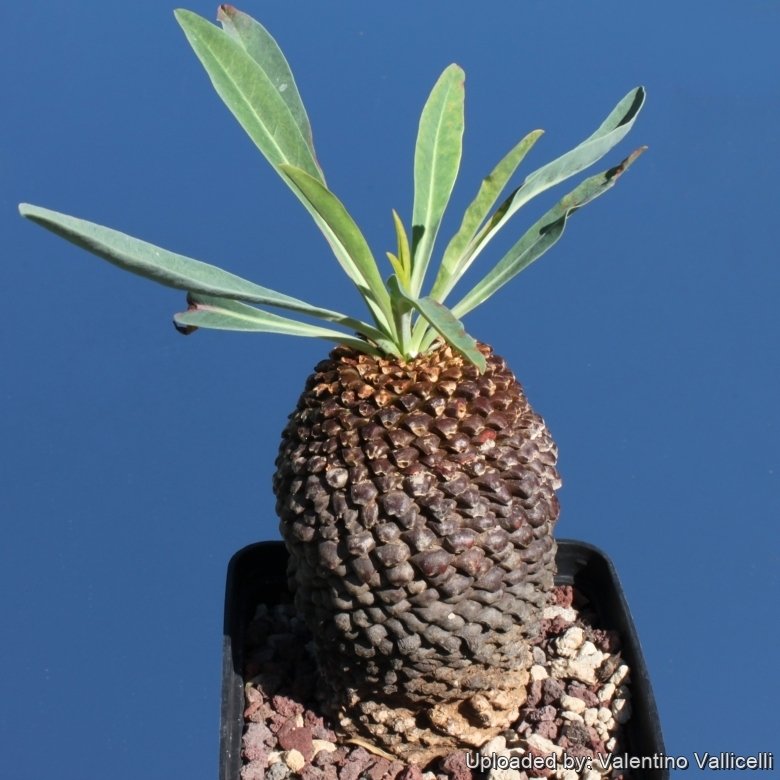Stem: It has a brown, spherical barrel-shaped or columnar caudex usually unbranched or occasionally few branched, that look like a pine-cone or a woody trunk. The stem which does not photosynthesise is a reserve for water, and usually does not grow much higher than around 20 cm and 7,5 cm thick. The trunk has a geometrically-neat tubercled surface, the tubercles (tuberculiform corky scars occasioned by falling away of the old leaves) are prominent dark reddish-brown up to 3 mm hight and crowded in many spiral series imbilicated in the centre giving a reticulate appearance to the surface.