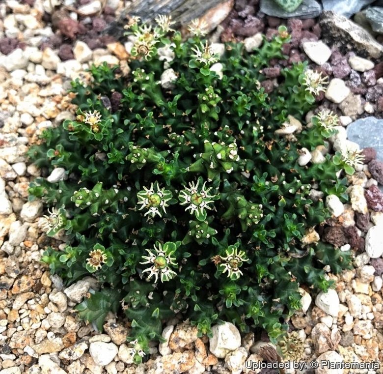 Description: Euphorbia planicepsSN|33622]]SN|33622]] is a low, succulent shrublet developing from a underground caudex (thickened stem) that is a continuation of the tuberous main root, divided below into carrot- like or longer roots. On the head and at the sides the there are a great number of branches which re-divide, forming a dense congested mat (up to 300 mm in diameter) which appears flat on the soil surface. This 'flat head' is due to the continual con-traction of the branches downwards, a feature which controls water loss in the arid areas in which it lives. Unlike the related species here it does not develop rhizomes. The plant is is spineless but the peduncles however persist for a year or longer, and are 1.5-2.5 mm long. Its remarkable flowers (cyathia), possess at the outer edge of the glands 3-4, conspicuous, teeth-like processes commonly referred as fingers.