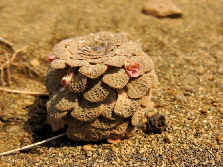 Leaves: Soft, semi-succulent, sand-coloured and finely textured . The thin hairs round the margins presumably help reduce transpiration by slowing down the movement of air around the plant, a very necessary adaptation to its windy environment.