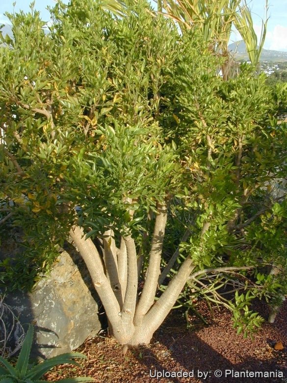Description: Mapou is the local name of Cissus mappiaSN|33406]]SN|33406]], a shrub or small tree 4-6 metres tall that can eventually reach a height of nearly 10 meters, and develop a vastly expanded, swollen, water-filled trunk. It looks like a minature baobab with a few sturdy branches easily breakable and in zigzag. By far it is the largest and most massive of the caudiciform or pachycaul members of the Vitaceae family. Apart from the Baobab (Adansonia digitataSN|102]]SN|102]]), this is without doubt one of the most spectacular pachycaul species. It bears compound deciduous leaves (odd number of leaflets). The leaflets are very variable. In adult specimen usually they are elliptic to oblong, light green with a pointed tip, to the contrary the juvenile leaflets can be very finely divided, thin, and red. The fruit look like small, red and furry grapes. As a case of "island gigantism", it is the only Cyphostemma species to attain the size of a large tree. It has also lost the vine-like tendrils of its genus, which falls within the greater Vitaceae (grapevine) family.